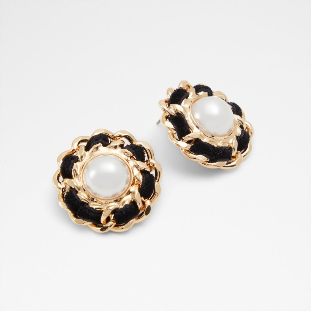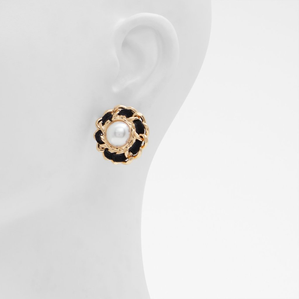 Dámské kulaté náušnice. Ve zlato-černé barvě. Proplítané. Uprostřed zdobeny perličkou.