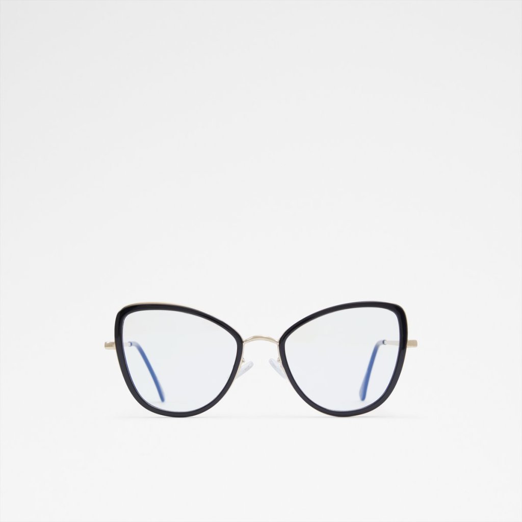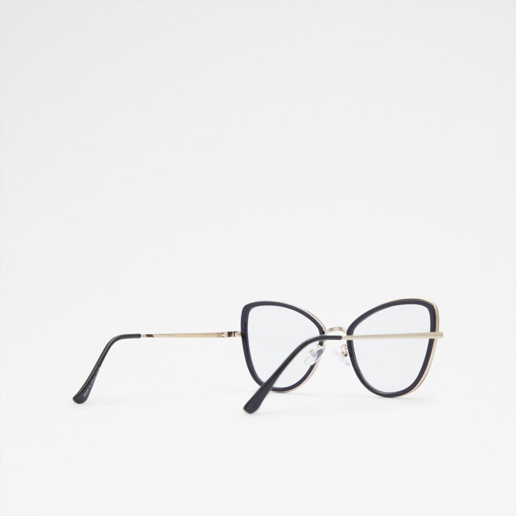 Dámské stylové brýle s čirými skly. Obroučky v černé barvě, se zlatými detaily.